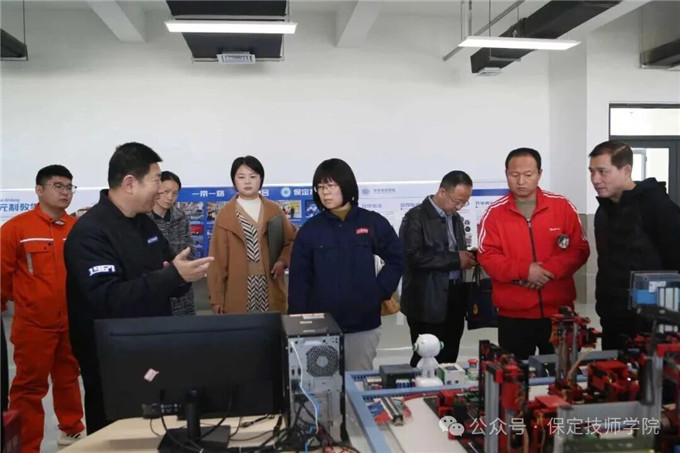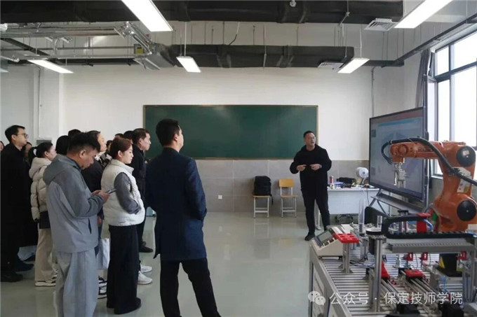 会后,与会人员到保定技师学院中德项目实训室参观,崔欣院长介绍保定技师学院的建设进展以及工作开展情况。